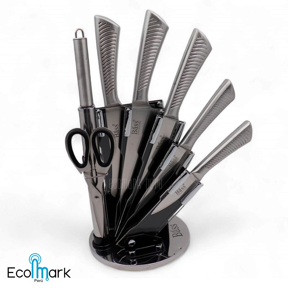 Juego de cuchillos profesional en acero inoxidable de alta calidad 8 piezas en nuevo diseño, con base giratoria de la marca BASS