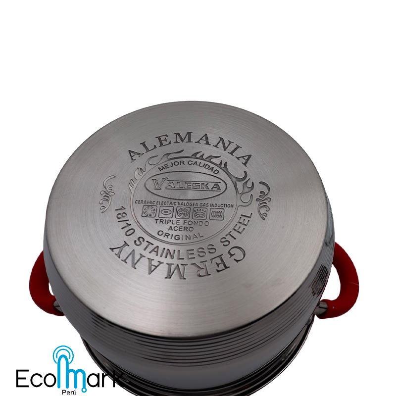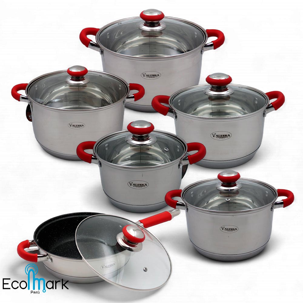 Set de ollas de 12 Piezas en Acero Inoxidable grado quirúrgico calidad alemana de la marca VALESKA con sello de fábrica en alto relieve y 7 capas, hecho y probado para cumplir con los estándares tradicionales de alta calidad.